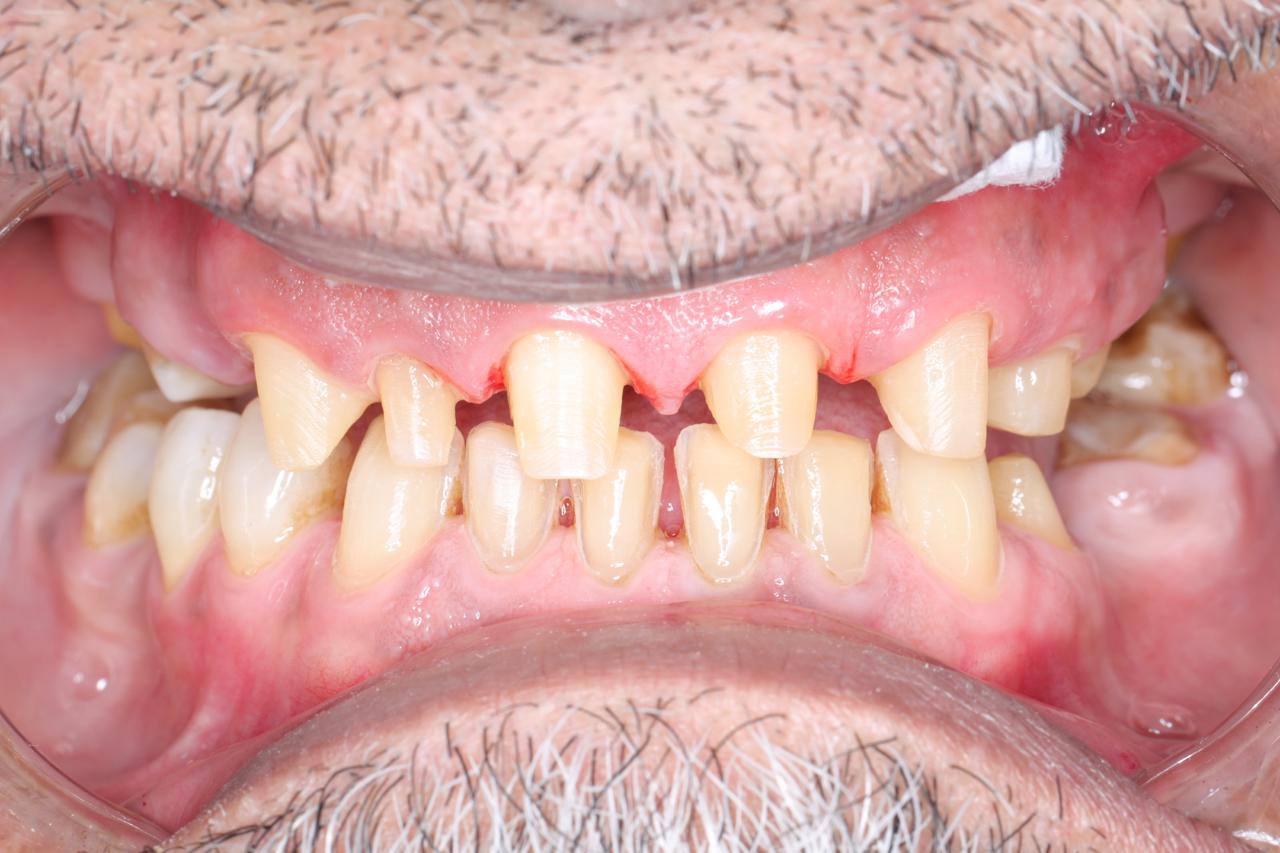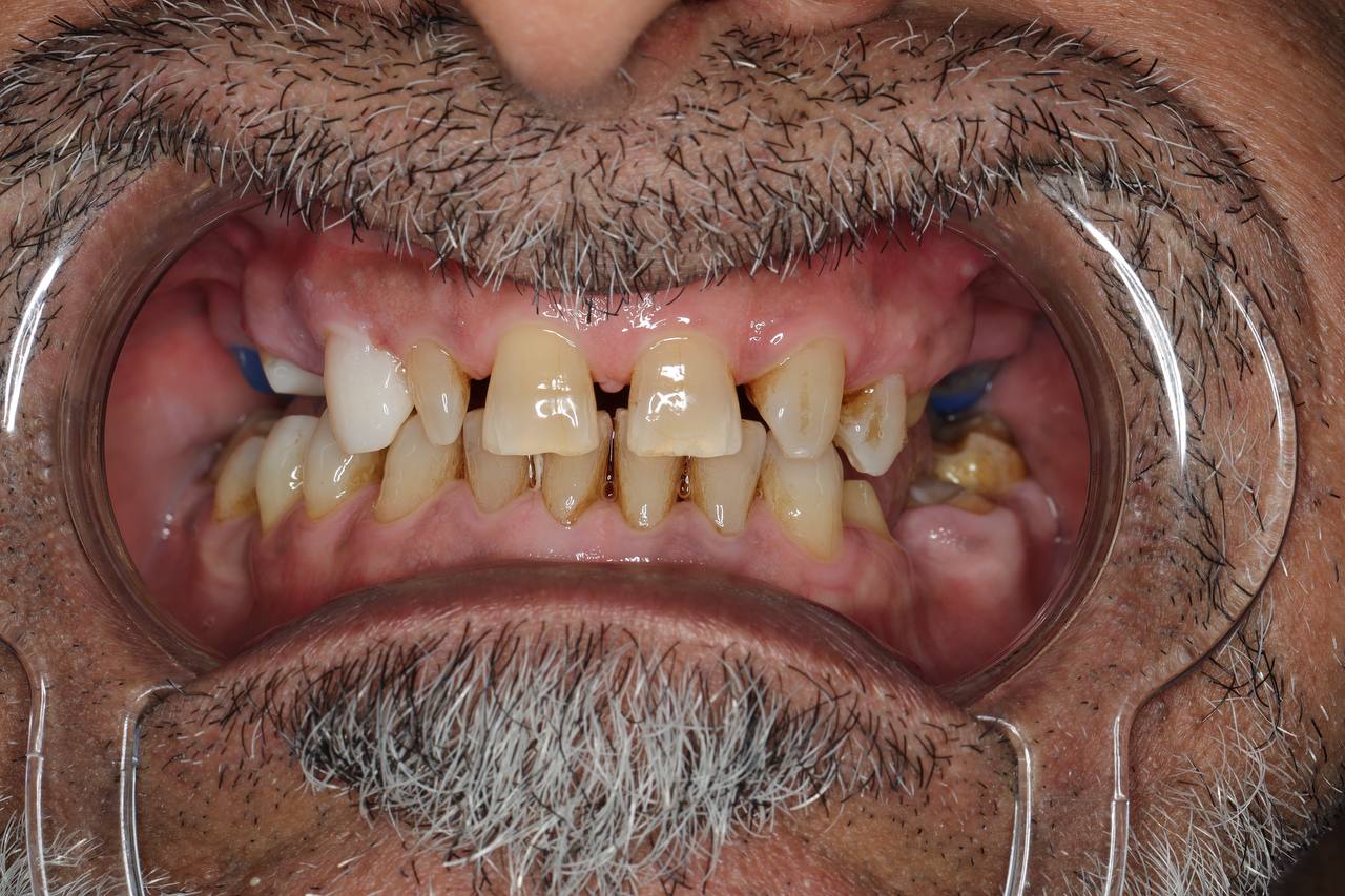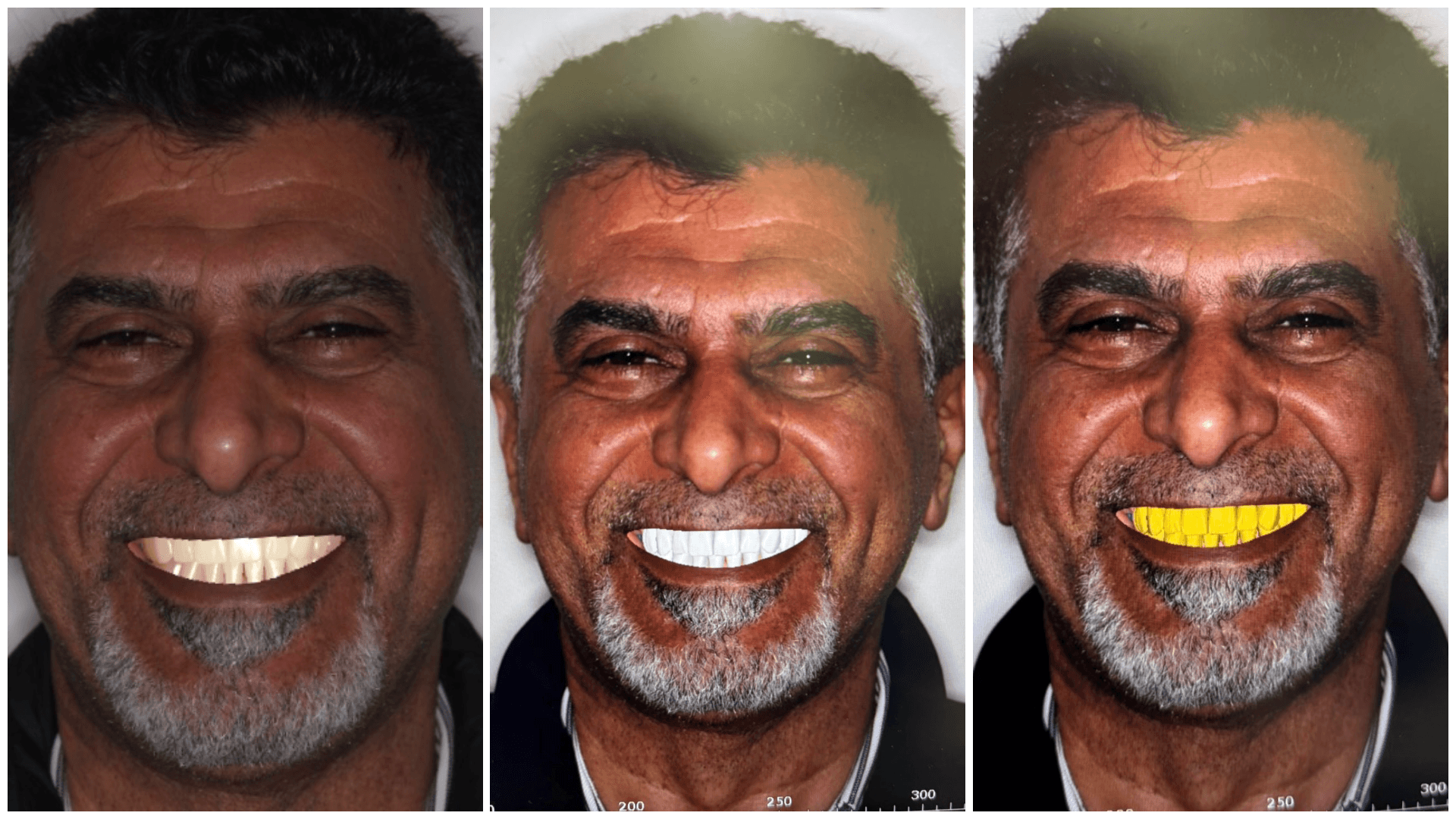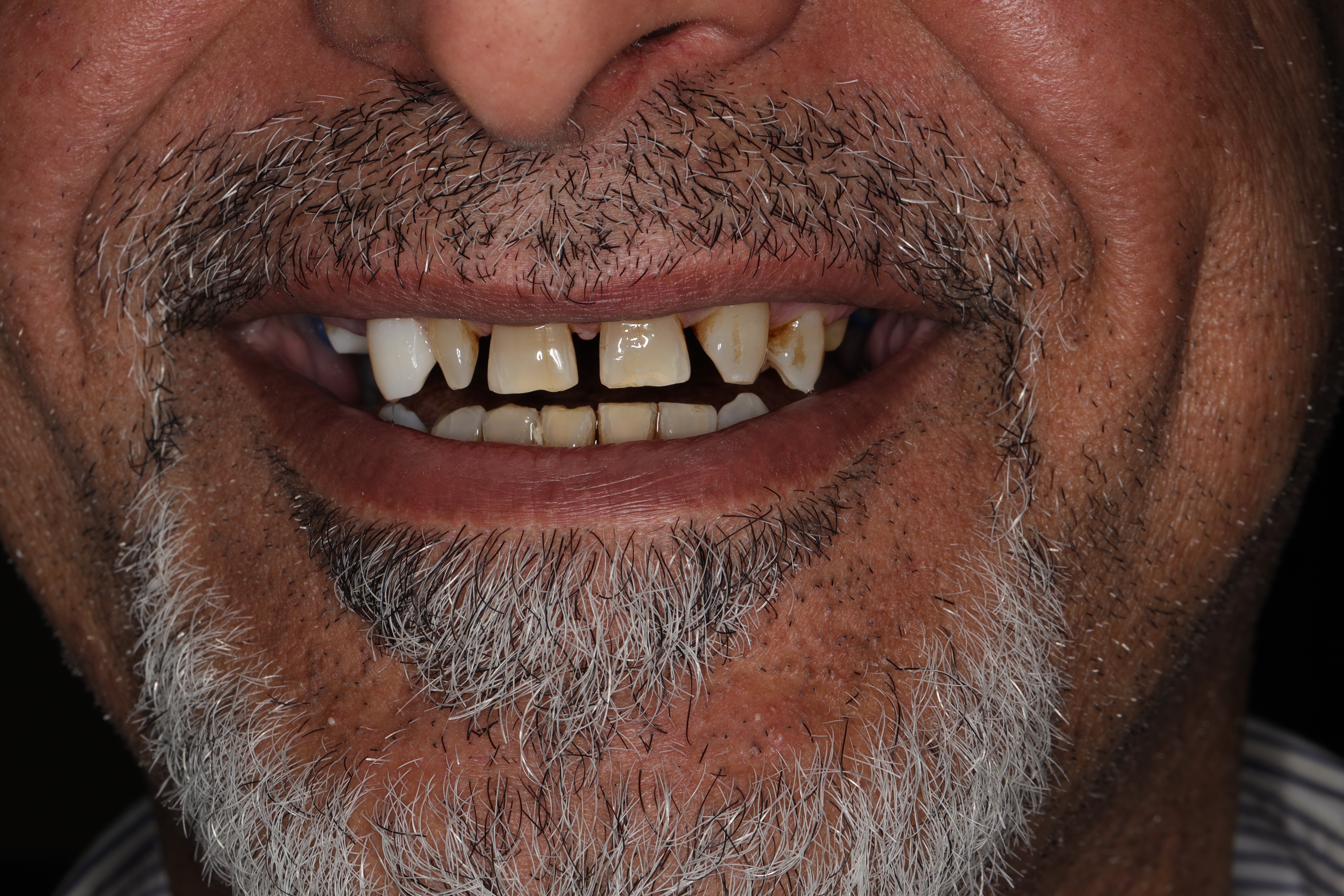 احمد خضير.. في بداية الخمسينيات من عمره, اختار دكتورة ميس من عيادات ريل كي تحل له مشاكله المتفاقمة في اسنانه.. فراغات كبيرة بين اسنانه الامامية, القاطع (اللاترال) الايسر غير موجود اساسا، تآكل في الاسنان الخلفية (العلوية)، اصفرار كبير وتصبغات في اسنانه العلوية والسفلية، عضّة عميقة ، تخلخل في المستوى الاطباقي.