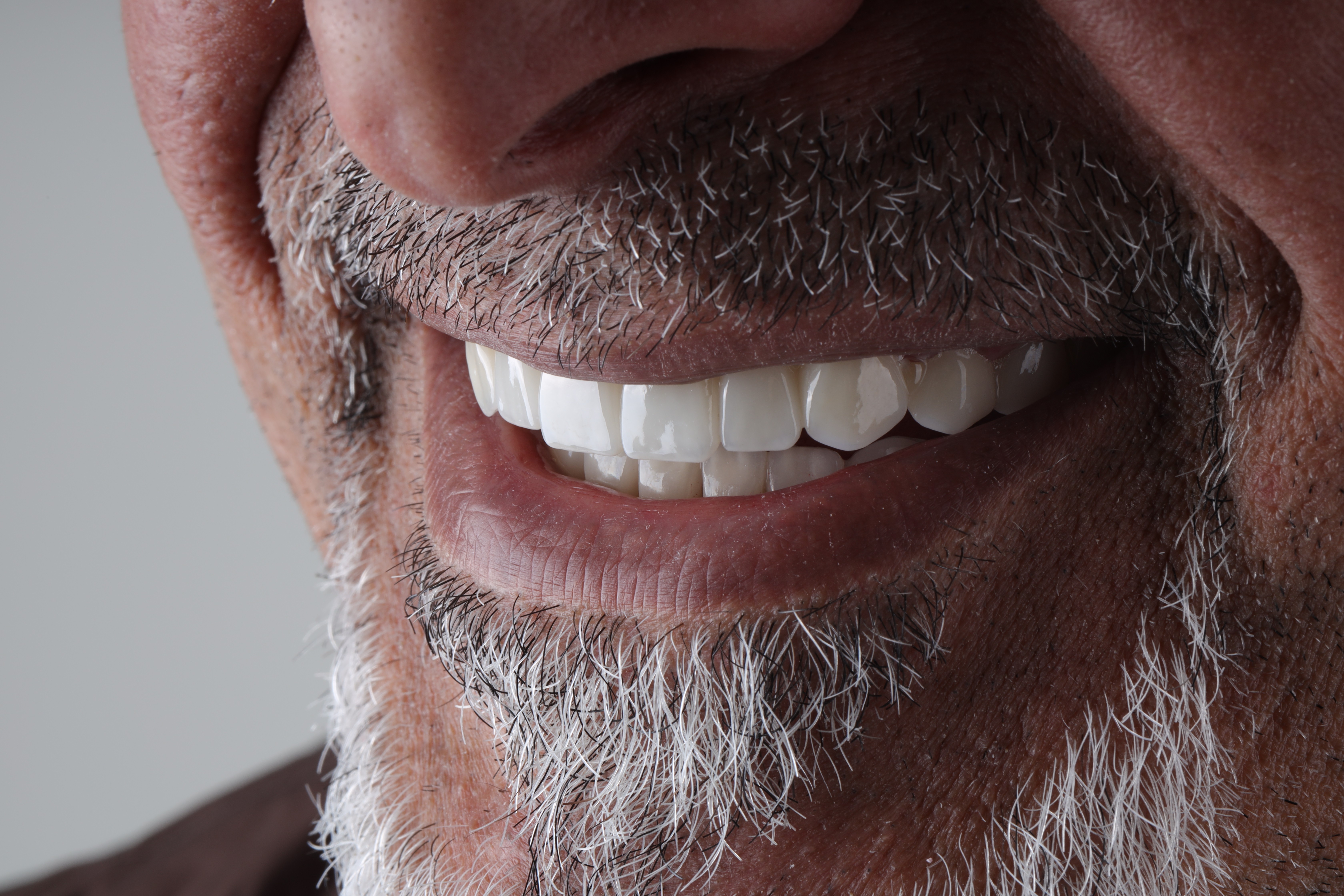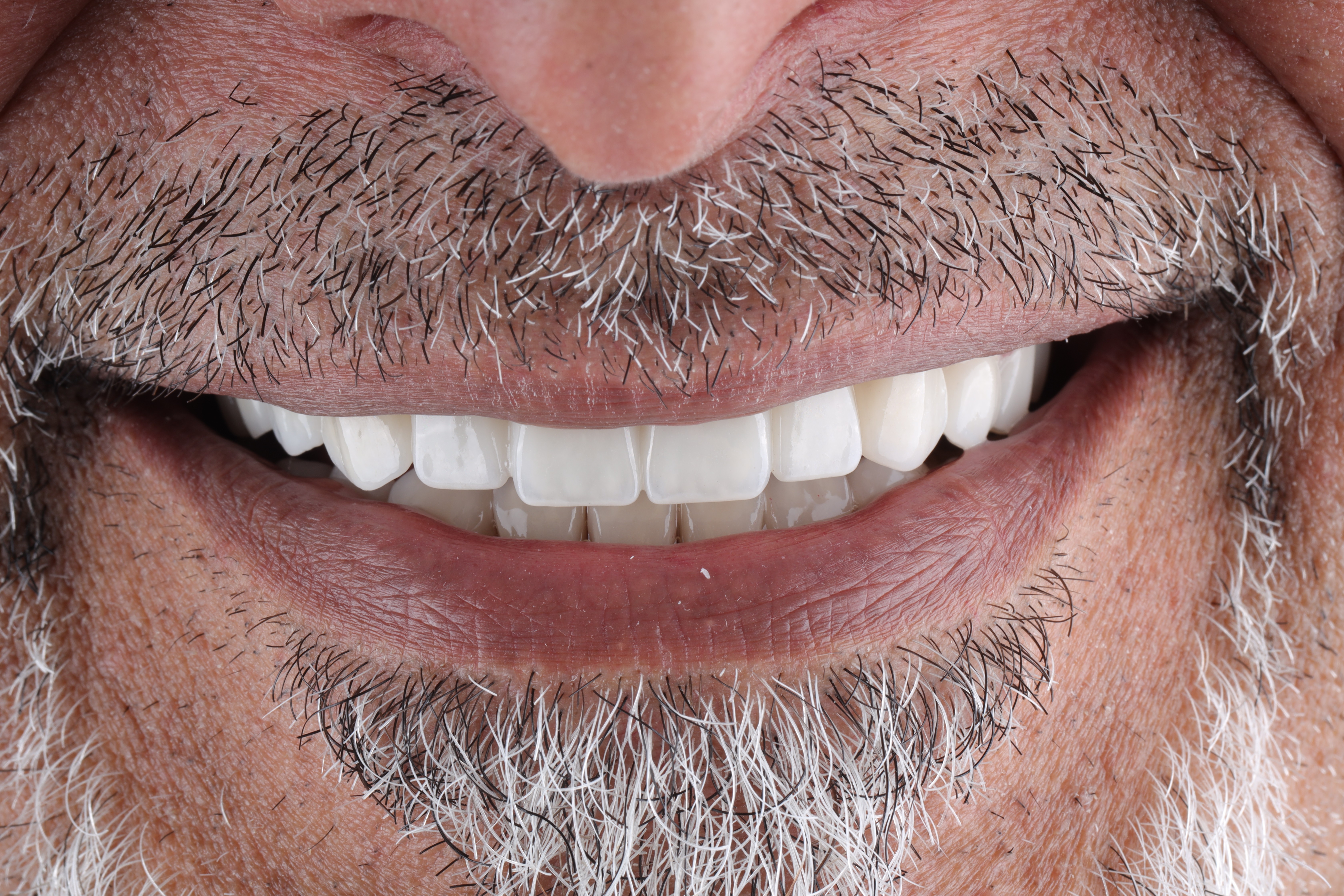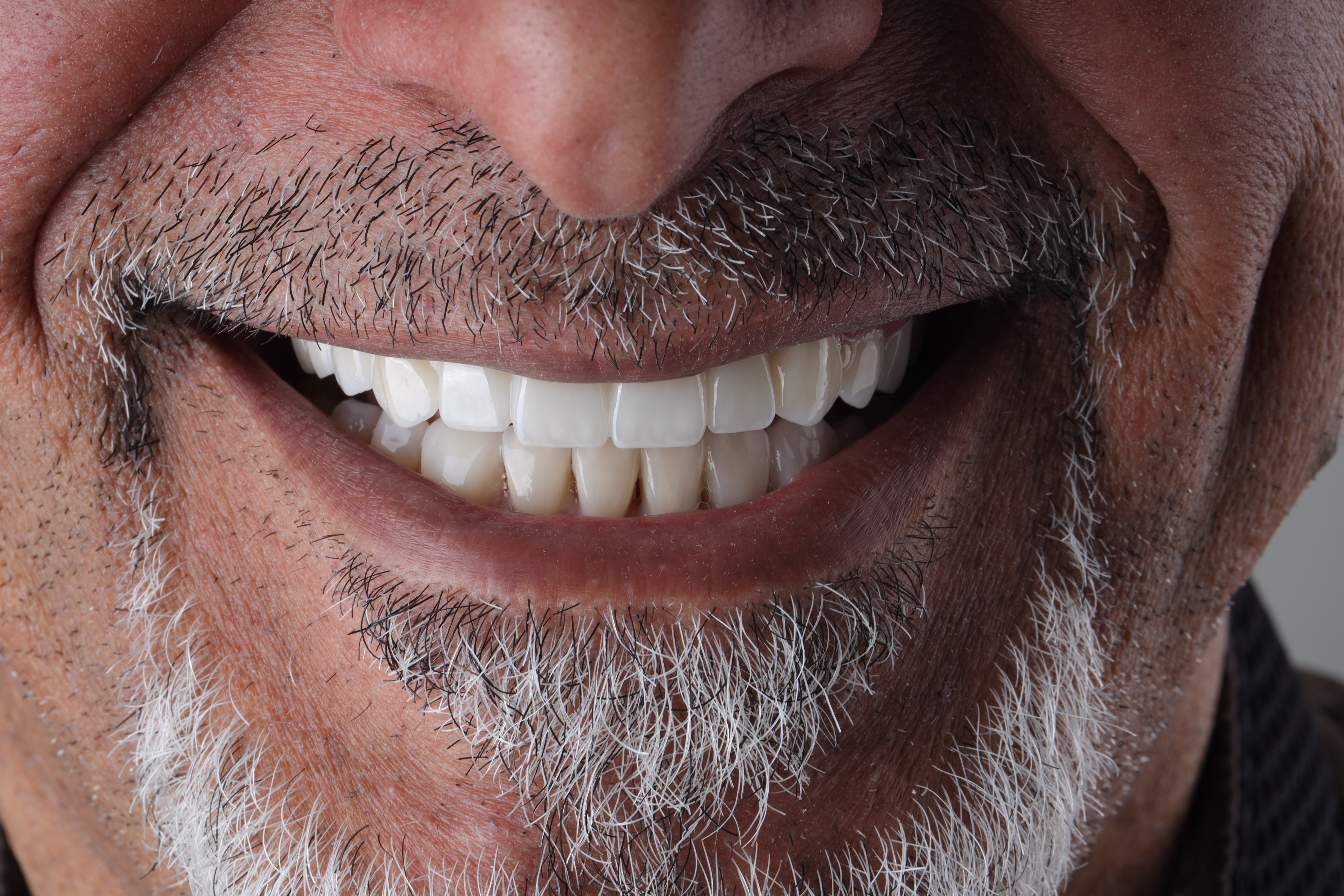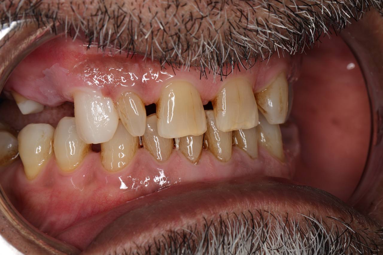 احمد خضير.. في بداية الخمسينيات من عمره, اختار دكتورة ميس من عيادات ريل كي تحل له مشاكله المتفاقمة في اسنانه.. فراغات كبيرة بين اسنانه الامامية, القاطع (اللاترال) الايسر غير موجود اساسا، تآكل في الاسنان الخلفية (العلوية)، اصفرار كبير وتصبغات في اسنانه العلوية والسفلية، عضّة عميقة ، تخلخل في المستوى الاطباقي.