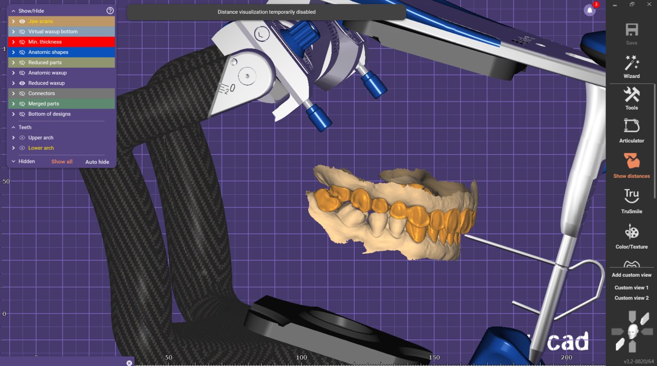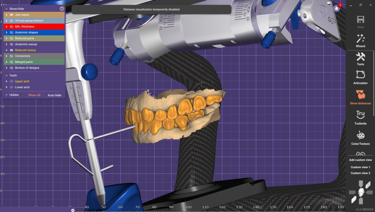 ثانيا قمنا بتصميم الاسنان وفقا للـ DSD ووطباعة الاسنان المؤقتّة بعد ساعات من ارسال الطبعة الرقمية بعد التحضير، في التصاميم الاولية والمؤقتات تحتاج سرعة كبيرة في اتمام هذين الخطوتين للمراجع الذي تكون معظم اسنانه محضّرة، لأنه سيكره مظهره بهذا المشاكل + سيعاني من تحسس عالي للحرارة والبرودة كما انّك توّد ان تحصل على افضل Emergence Profile حول السن المحضّر كي تقوم بتهيئته للتراكيب النهائية كما انّك لن تهمل اهمية تضبيط الاطباق والمستوى الاطباقي، لذلك كان لزاما علينا في هذه الحالة ان نصمّم الابتسامة آخذين بنظر الاعتبار الـ Protrusion , Retrusion, Lateral Movements ولذا فأستخدام الـ Digital Articulater واجراء الـ Simulation لجميع الحركات المتوقعة هو اجراء لازم وضروري.
